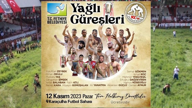 Fethiye Belediyesi tarafından düzenlenecek Yağlı Güreşler, 12 Kasım Pazar günü Karaçulha Futbol Sahasında yapılacak. Cumhuriyetimizin 100. yılına özel bu büyük etkinlik, Kırkpınar’ın Altın Kemerli Baş Pehlivanlarını Fethiye’de buluşturacak. Ege ve Akdeniz’in sezon finali olarak görülen güreş 12 Kasım 2023 Pazar günü Fethiye Karaçulha Futbol Sahasında yapılacak.